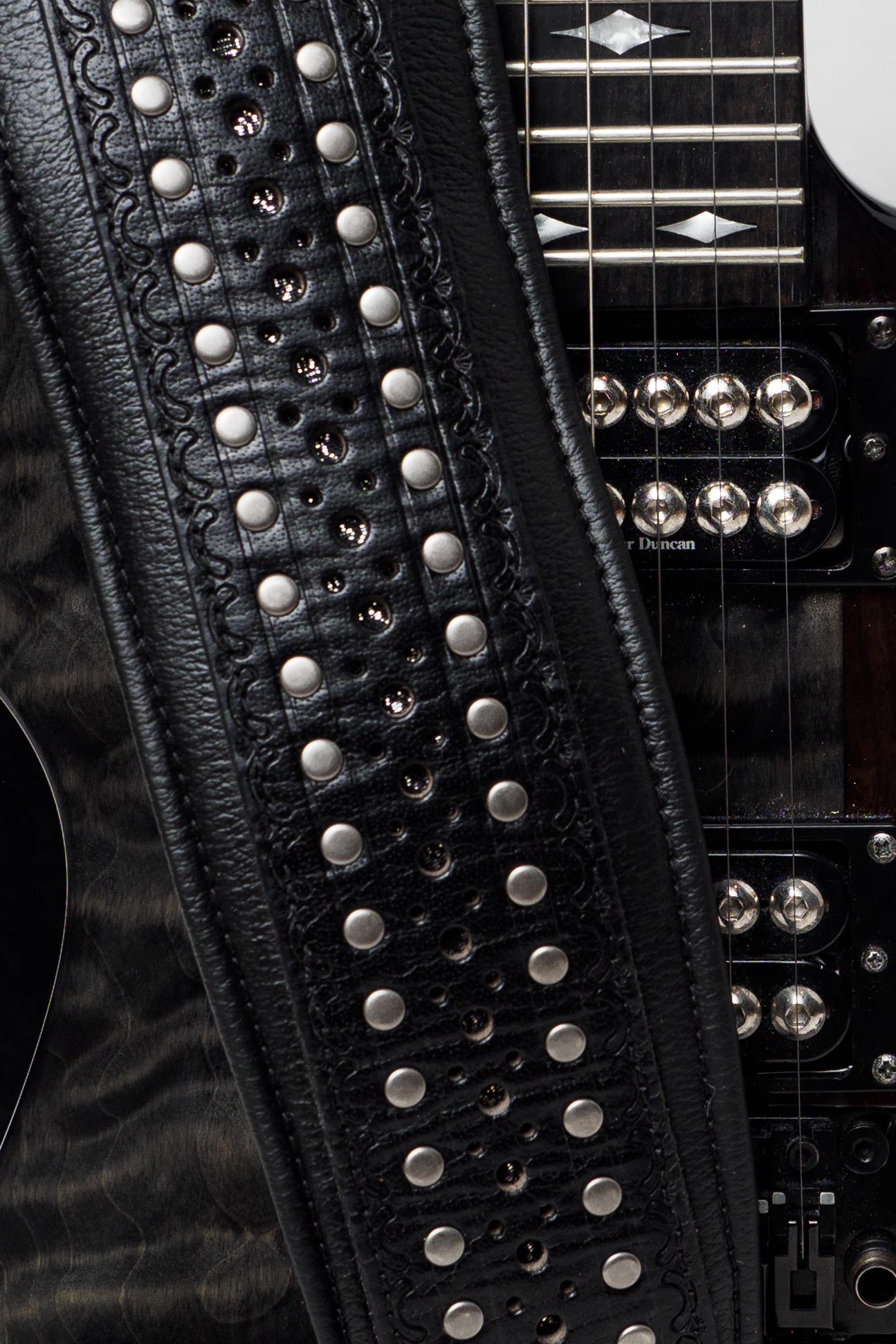 Hellrider - This is one of my own ideas which @TVvoodoo helped design. I wanted a Judas Priest, 80s, Biker look ... and Brad NAILED IT! Complete with a leather jacket buckle, spikey bits and studs, white stitching and of course a cross with a skull. Paired up with my White MIJ Jackson DK2.