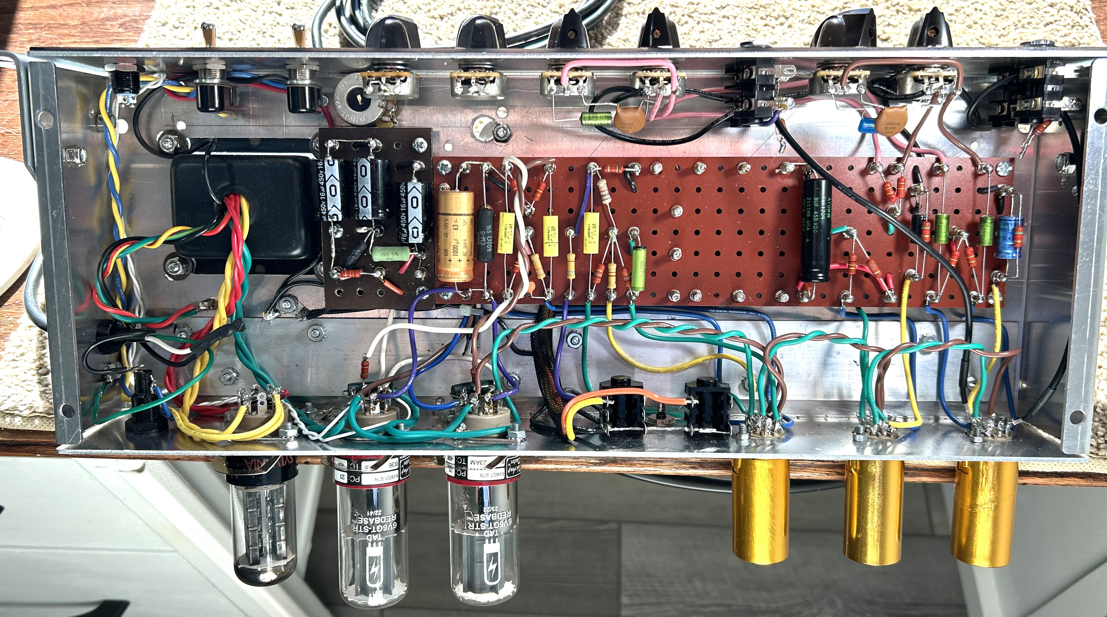 At the retirement point of building amps, hobby, I have three amps left to tidy up. One is a 6G3 that I had built in a chassis to match an existing cabinet, and kept the filter caps inside so space ran out quickly for those. I added a small daughter board, not my best work, to adjust voltages to hit Fender specs. I hit nightmares trying to tame the tremeolo. It always had issues, you name them.