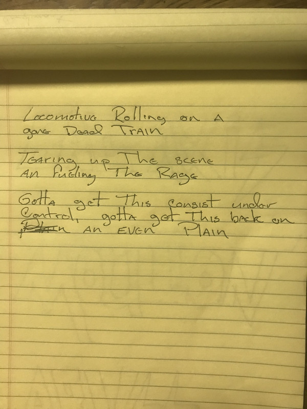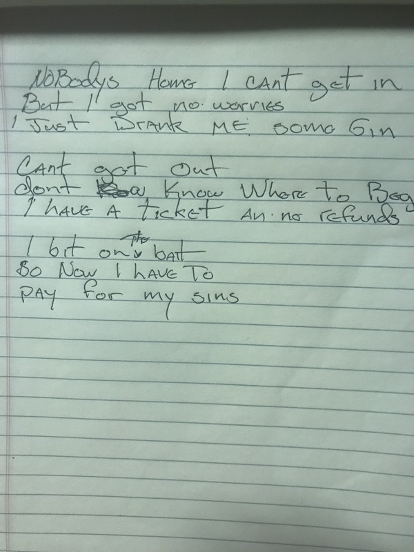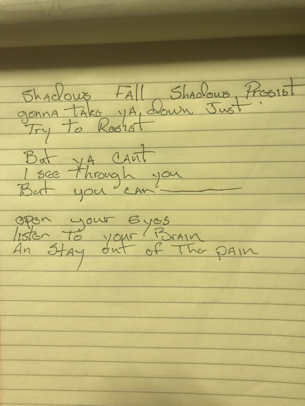 4. The first three lines of THREE different new and cool original songs you’re now hashing out with the boys, handwritten. (No titles yet).