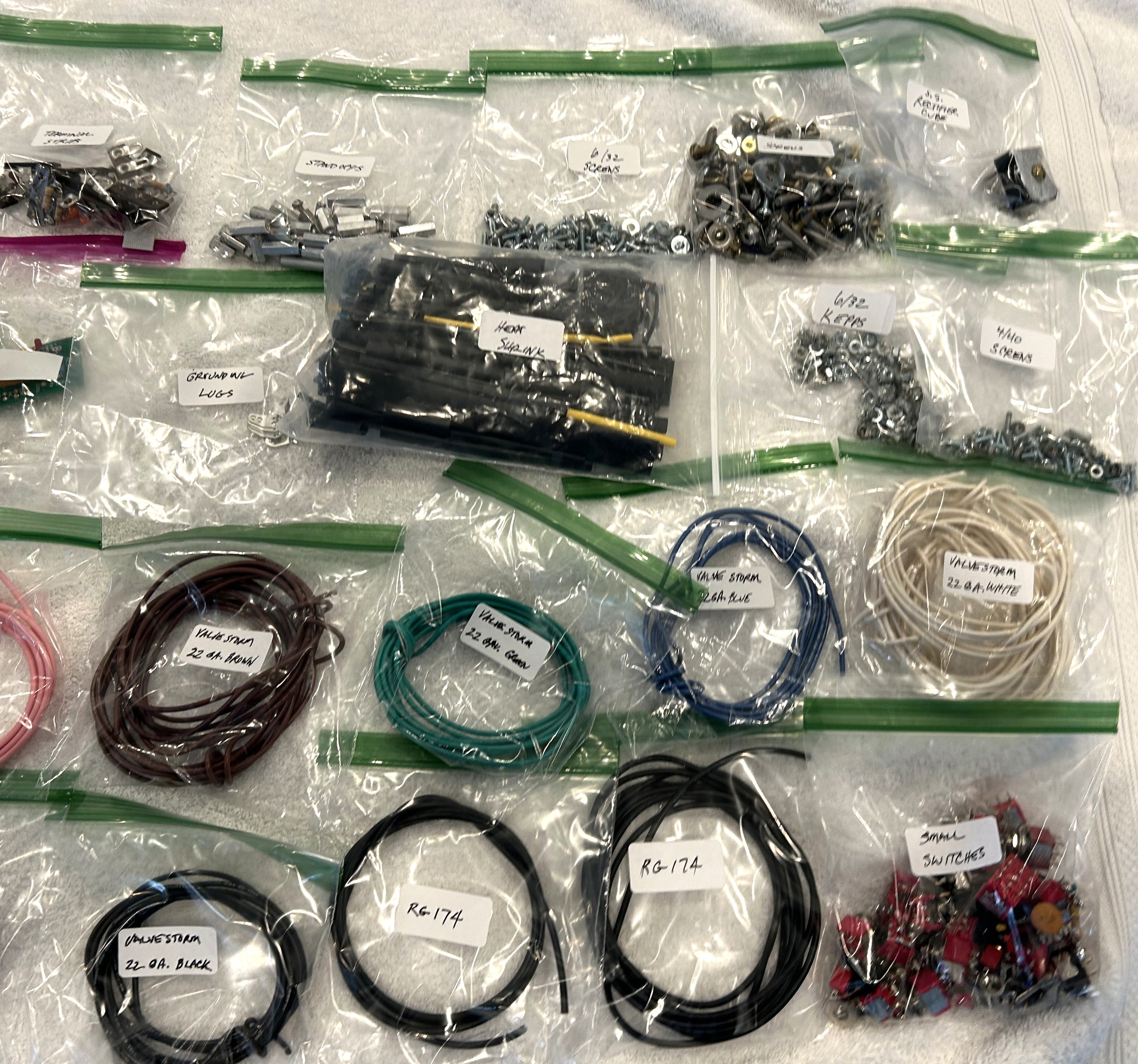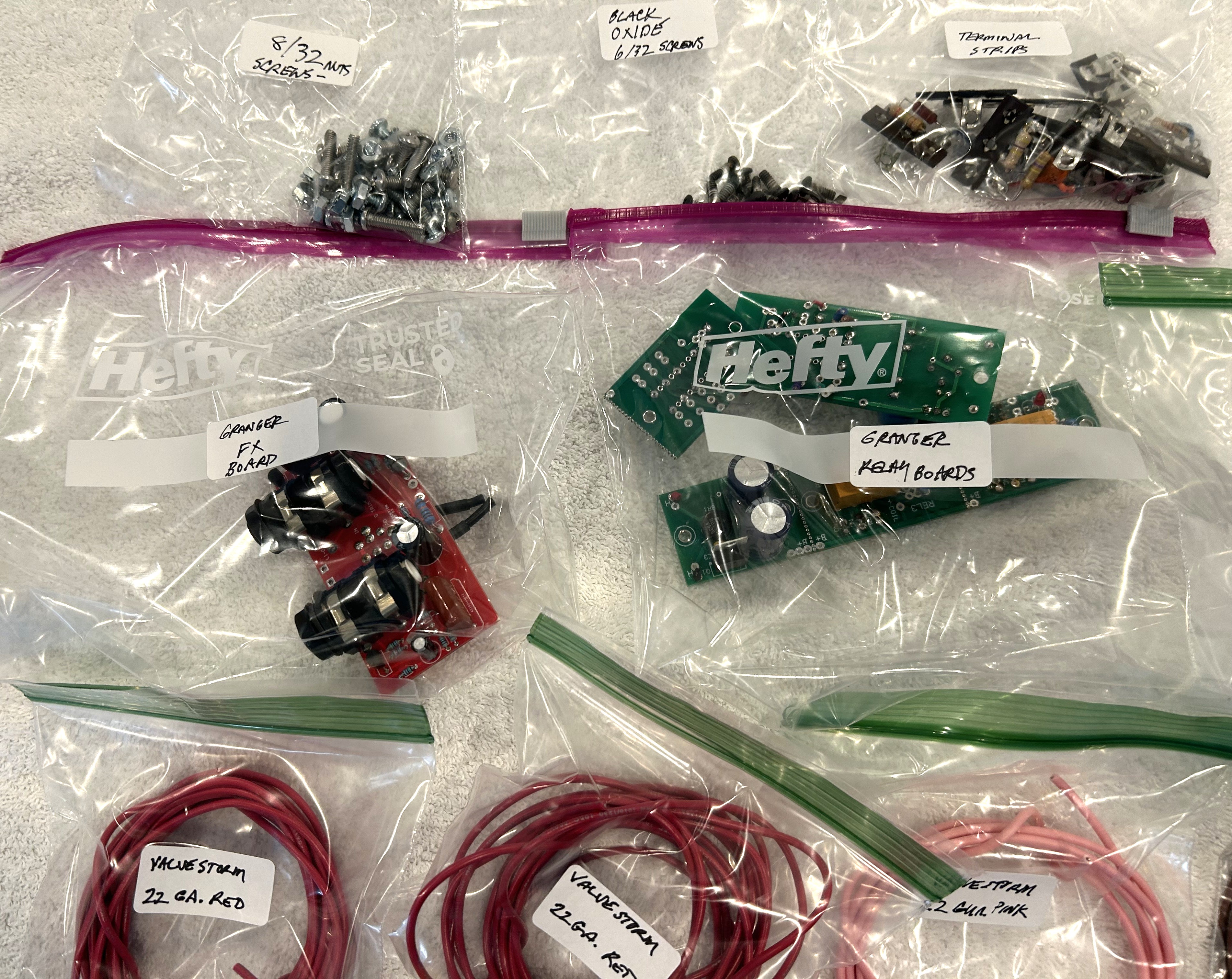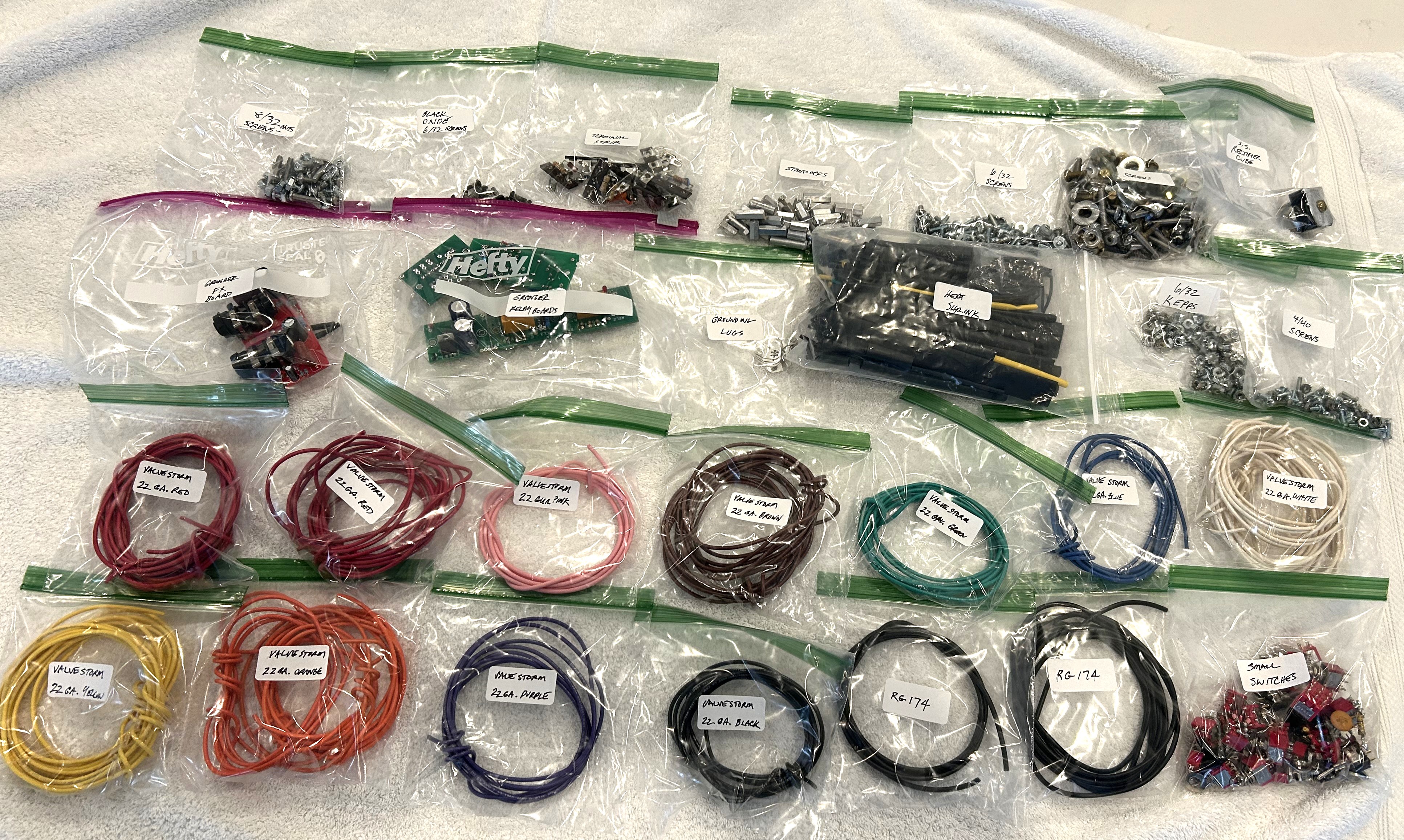 For sale is more of the components out of my parts bins. I have retired from tube amp building and am selling everything off. This is the last of the 3 different listings for all of the electronic components. None of these listings include the parts bin cubbies, these listings are for the components that have been removed from the parts bins and separated into zip lock baggies for shipping. $75 for this the lot which is a steal as the Granger FX loop board alone is over $50, does not include the parts bin. Shipping is a flat fee of $12 to the Continental US only.