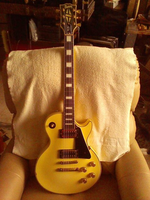 '77 Greco LP Custom. The owner had installed hot Duncan Distortion pickups, so it needs different amp settings from my other guitars. Still, once in a while I enjoy having a high output axe to play with.